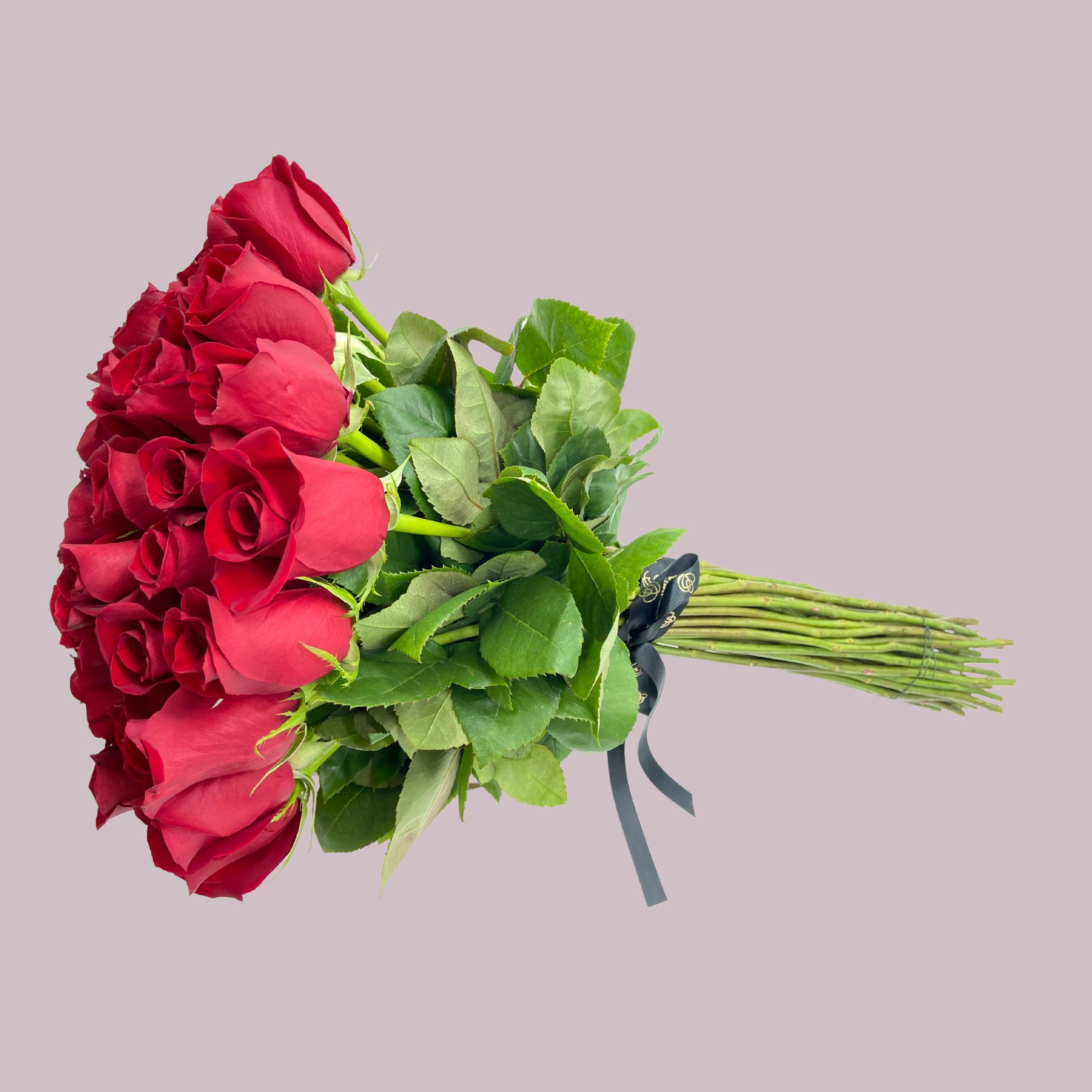 This is a striking bouquet of 50 long-stemmed red roses, elegantly arranged with black and gold ribbons. The contrasting colours of the ribbons perfectly complement the rich red hue of the roses, creating a visually stunning and sophisticated look.