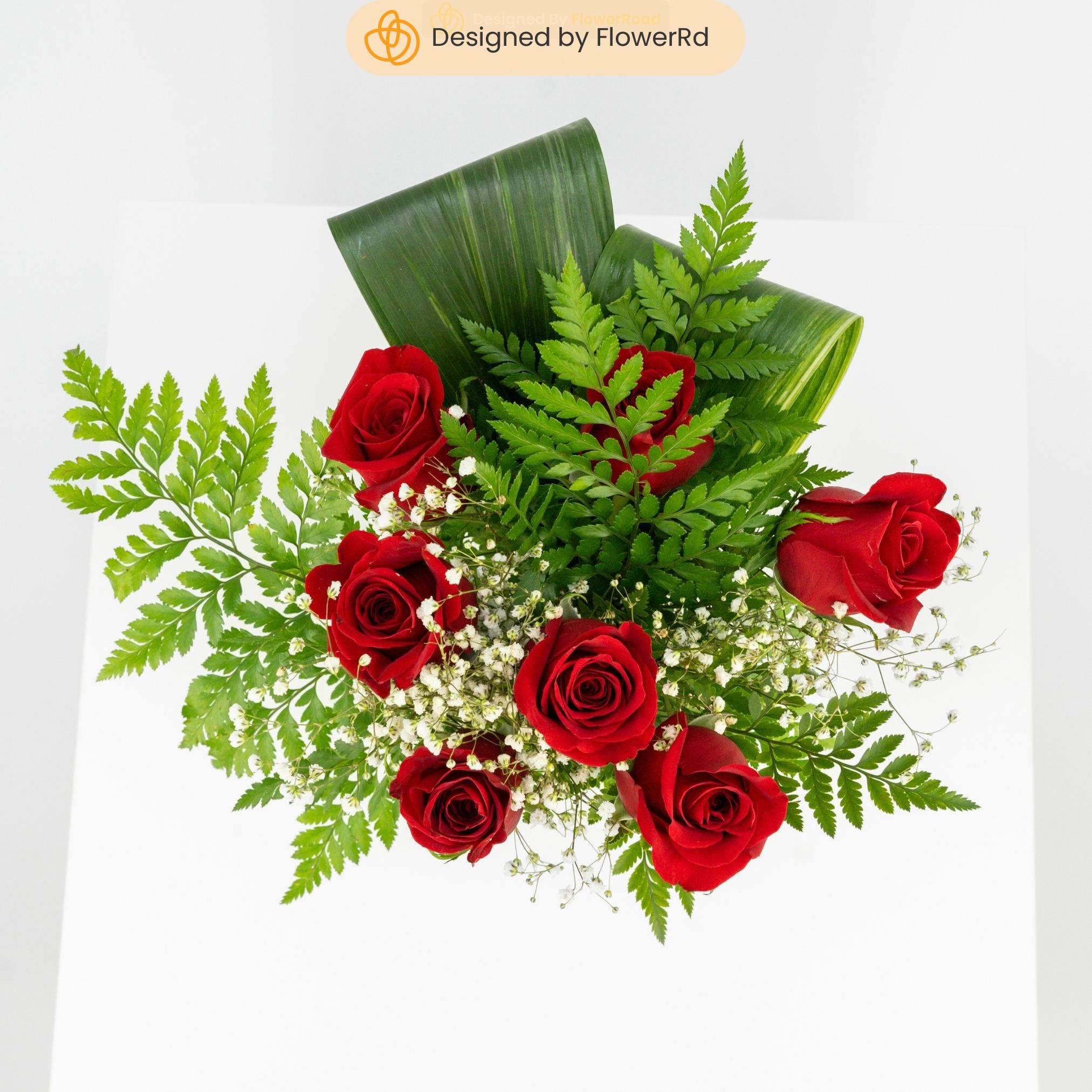 This exquisite bouquet of 7 deep red roses is a true classic, paired with delicate baby's breath, green dracaena and lush leather leaf foliage to create a stunning arrangement. The clear vase beautifully showcases the blooms and the foliage, while the green and yellow ribbon that winds around the vase adds a touch of whimsy and playfulness to the display.