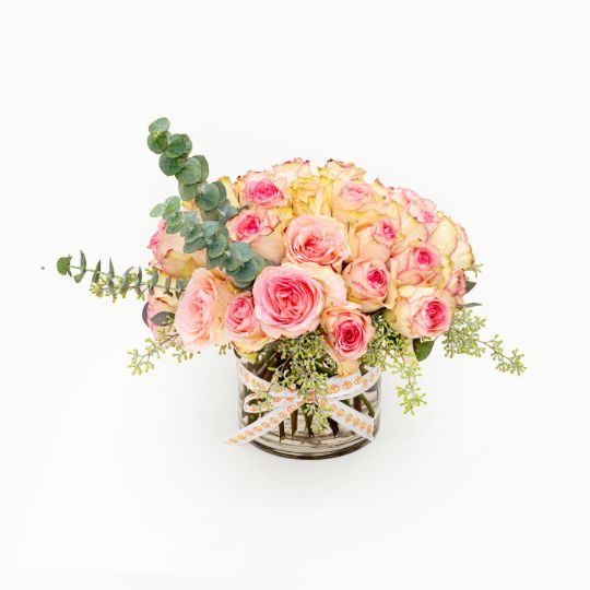 Dive into a realm of refined beauty with our "Esperance Elegance" arrangement. This bouquet boasts 35 exquisite Esperance roses, each bloom a harmonious blend of soft pink and cream hues, exuding an air of timeless grace. Interspersed with the silvery-green tendrils of eucalyptus leaves, the arrangement not only captivates the eyes but also invigorates the senses with a subtle, refreshing aroma. Perfect for moments that call for sophistication and charm, this ensemble is a testament to nature's artistry and elegance.