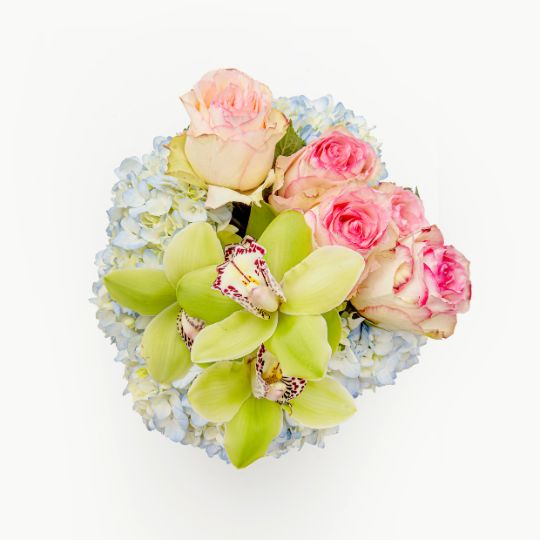 Blooms in Bliss: A chic arrangement featuring 6 stems of Esperance Roses, 5 Baby Blue Hydrangeas, and two vibrant Green Blooms of Cymbidium, carefully presented in a sleek cylindrical ceramic vase adorned. Embrace the elegance of nature's palette in this beautiful composition.