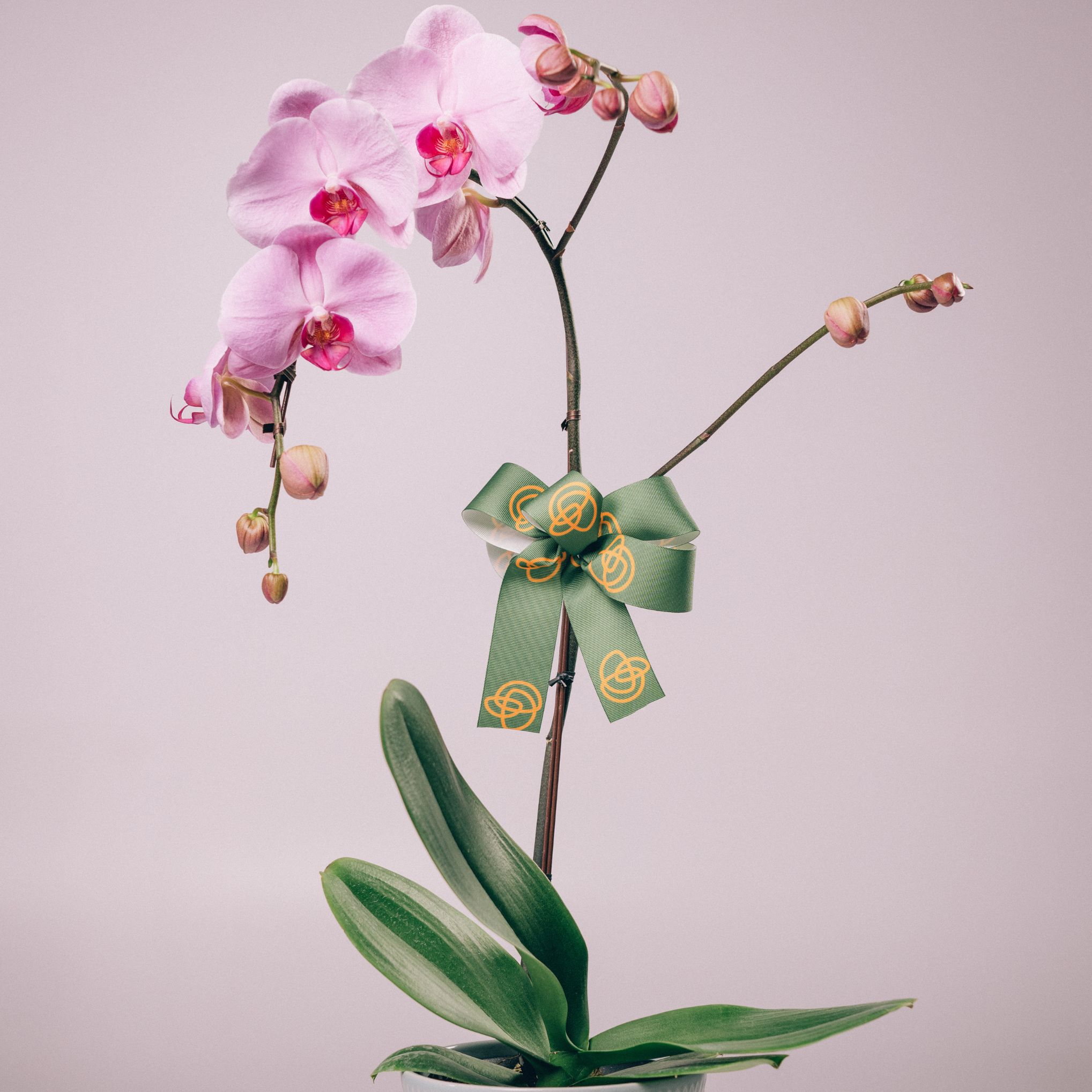 The pink orchid is a striking flower that exudes elegance and grace.To accentuate the beauty of the pink orchid, a green ribbon can be used to add a touch of freshness and vitality to the arrangement. The green ribbon's vivid hue adds a sense of renewal and growth, creating a sense of liveliness and optimism.